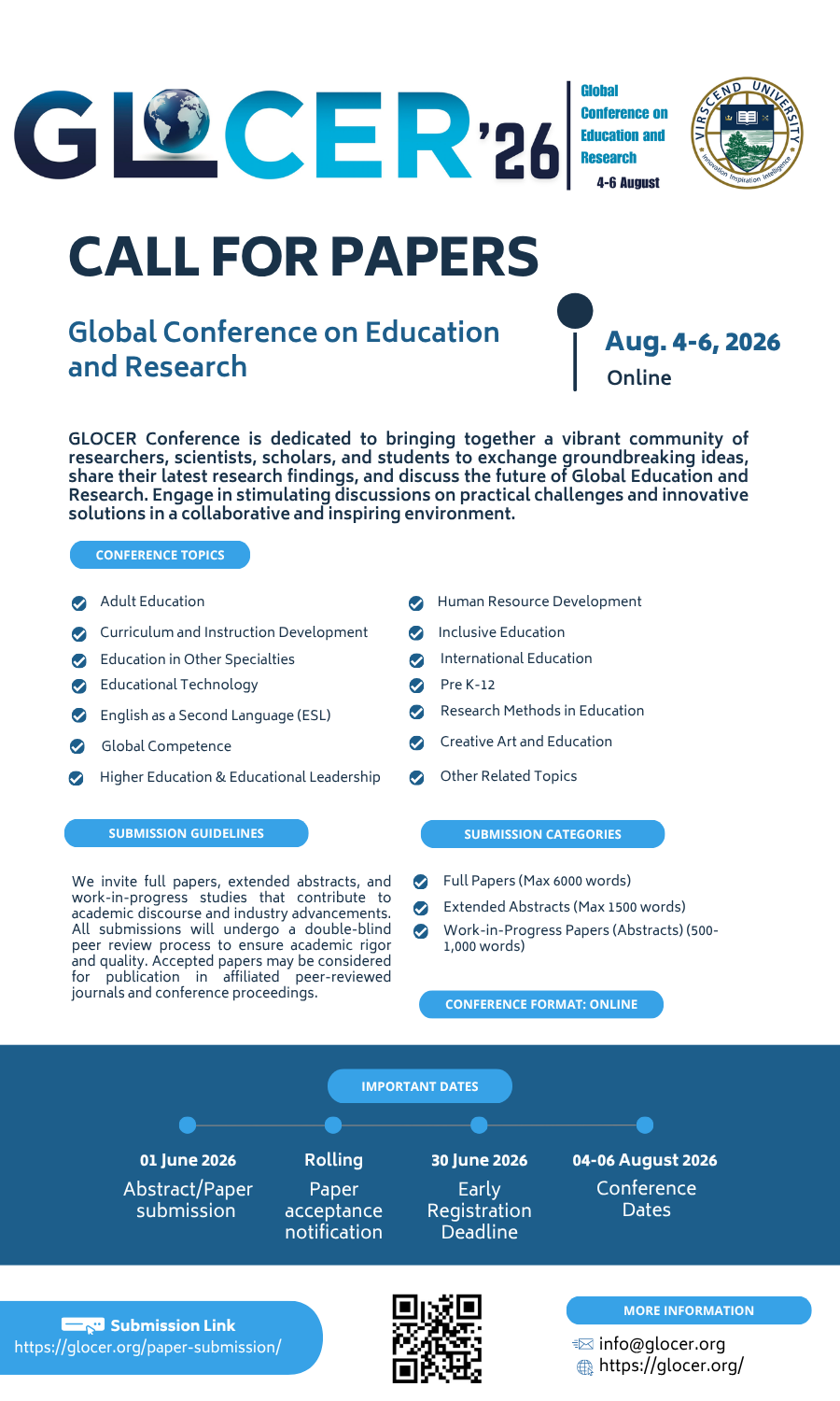 Welcome to the official website of the 6th Global Conference on Education and Research (GLOCER 2026), which will be held on August 4-6, 2026, virtually. Proudly organized and sponsored by Virscend University, this prestigious event continues its tradition of excellence for the sixth time. For more information, please see our previous conference here.